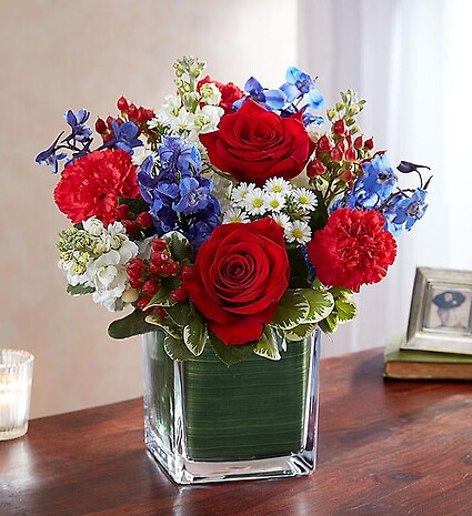It’s beautiful to honor one who held their country dear with a patriotic homage. Our sympathy arrangement of red roses, white stock, and blue delphinium, expertly gathered in a clear glass cube lined with Ti leaf ribbon, makes for a respectful and exquisite gesture of comfort and healing.